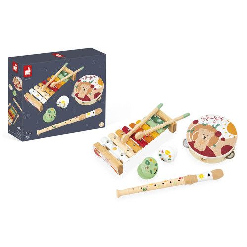Teilen Sie die Liebe zur Musik! Mit diesem 4-teiligen Musikspielzeug-Set werden Groß und Klein ab 18 Monaten in die Freuden der Musik eingeführt. Für Babys ist ein Klangspielzeug eine tolle Möglichkeit, ihr Gehör zu stimulieren und gleichzeitig ihr Interesse an verschiedenen Klängen zu wecken. Für Kinder ab 3 Jahren ist es ein Riesenspaß, die Großen nachzuahmen und mit ihren eigenen Spielzeuginstrumenten zum Star zu werden! Dieses Set von Spielzeug-Musikinstrumenten enthält: 1 Xylofon aus Holz und Metall mit 8 Klangstäben und 2 Schlägeln, 1 liebevoll illustriertes Tamburin, 1 bunte Holzflöte, 2 peppige Kastagnetten. Das sind 4 Spielzeuge, die der musikalischen Früherziehung gewidmet und schöne gemeinsame Momente garantieren! Um Ihrem Baby eine Vielzahl von Klängen vorzustellen oder ein Konzert mit mehreren Personen zu veranstalten, ist dieses Set von Kinderinstrumenten ideal. Jedes erzeugt einen anderen Klang und ist auf eine bestimmte Art und Weise zu handhaben, was dieses Spielzeuginstrumenten-Set zu einem perfekten Geburtstagsgeschenk für neugierige Kinder oder angehende Musiker macht! Ideal, um die Fantasie der Kinder anzuregen. Sie können sich vorstellen, auf der Bühne aufzutreten oder ihren Kuscheltieren Musikunterricht zu geben. Was wird ihr bevorzugtes musikalisches Spielzeug sein? Und Ihres? Dieses Set aus 4 Spielzeuginstrumenten ist Teil unserer Gioia Kollektion, einer fröhlichen Produktreihe zur musikalischen Früherziehung, die Kleinkinder auf spielerische Weise in die Welt der Klänge einführt und ihnen schöne gemeinsame Momente mit der Familie schenkt. Hergestellt aus FSC™ -zertifiziertem Holz.
