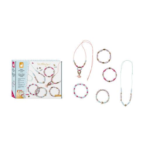 Heute holen wir unseren schönsten Schmuck hervor, und da wir ihn selbst hergestellt haben, macht es noch mehr Spaß, ihn zu zeigen! Mit diesem Kreativ-Set können wir drei schöne Schmuckstücke mit Blumen-Bändern herstellen: 2 Armbänder und 1 Halskette mit kleinen goldfarbenen Vögeln. Ideal, um die Schmuckstücke Freundinnen oder der Mutter zu schenken, wenn sie fertig gebastelt sind! Diese kreative Aktivität für Kinder ab 6 Jahren fördert Ruhe und Konzentration. Dieses Set enthält Anleitungen und das Material, das für die Herstellung von zwei Armbändern und einer Halskette benötigt wird: 2 Blumen-Bänder, 1 Kette mit Mikroperlen, 5 Anhänger (Blatt/Vögel/silberne Perle/Pompon), 1 Schließe, 1 silberne Perle, 6 Ringe, 2 silberne Endstücke und 1 Anleitung.