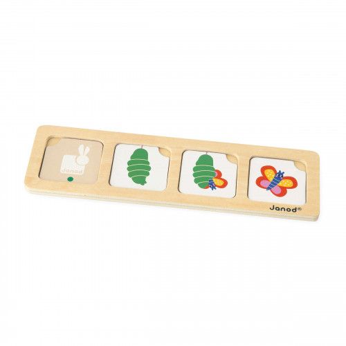 Den Begriff der Chronologie zu verstehen, ist ein wichtiger Lernschritt im Kindergarten. Im Vorschulalter beginnen Kinder, sich mit Folgen vertraut zu machen, die sie lernen müssen, um sie in die richtige Reihenfolge zu bringen. Erleichtern Sie Kindern ab 3 Jahren mit diesem pädagogischen Spiel aus Holz diesen Lernschritt. Um auf spielerische Weise sein logisches Denken zu üben, muss sich das Kind die 4 Karten einer Szene genau ansehen und in die richtige Reihenfolge bringen. Es gibt 10 verschiedene Szenen zum Nachbilden! Dieses Spiel fördert die Entwicklung von Denkfähigkeit und Aufmerksamkeit. Es erweitert den Wortschatz der Kinder und ihr Wissen über die Natur. Wie wird aus einem Samen eine Blume? Wie entwickelt sich ein Schmetterling? Die Holzunterlage ist sehr clever gestaltet! Farbige Punkte ermöglichen es, die richtige Position der Karte zu überprüfen, sodass das Kind ganz eigenständig Spaß haben kann. Sie können auch zu zweit spielen und Ihr Kind beim Lernen begleiten: Lassen Sie es die Karten auf die Unterlage legen. Anschließend kann es Ihnen den Ablauf der Szene erklären. Eine Anleitung ermöglicht es Ihnen, dieses Spiel für Kinder der jüngsten Altersgruppe optimal zu nutzen. Dieses Spiel ist Teil einer pädagogischen Produktreihe, die in Zusammenarbeit mit einer Lehrerin entwickelt wurde, um dem Lernprozess und dem Lernstoff der einzelnen Stufen bestmöglich zu folgen. Es ist aus Holz und Pappe, FSC®-zertifiziert