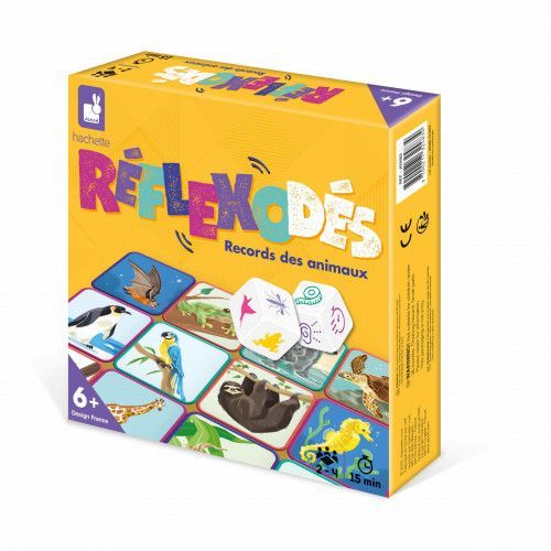 Wer weiß am meisten über Tiere? Stellen Sie Ihr Wissen mit diesem Brettspiel auf die Probe, bei dem schnelles Denken und Handeln gefragt ist! In der Mitte des Tisches liegen 36 Kärtchen mit schönen Bildern von unseren Lieblingstieren. Es wird mit zwei Würfeln gespielt: Der eine zeigt eine Tierkategorie, der andere die Art des Rekords. Sie sollen nun die Informationen auf den zwei Würfeln so schnell wie möglich kombinieren und das entsprechende Kärtchen auf dem Tisch finden. Der Erste, der auf das richtige Kärtchen tippt, hat gewonnen! Dieses Spiel besteht aus 36 doppelseitigen Kärtchen, 2 Würfeln mit jeweils 6 Bildern von „Kategorien“ (Landsäugetiere, Meerestiere, Reptilien, Vögel, Amphibien, Insekten) und 6 „Rekorden“ (am schnellsten, langsamsten, kleinsten, größten, lautesten, gefährlichsten). Die Spielregeln sind nur auf Französisch erhältlich. Eine Spielrunde dauert etwa 15 Minuten. Das Spiel ist für 2 bis 4 Spieler bestimmt. Es ist ideal für Kinder ab 6 Jahre.