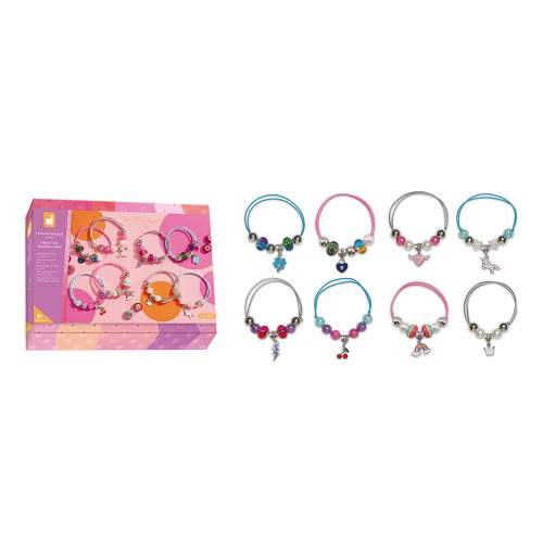 Zuversicht, Freude oder Glück: Welche Superkraft wird Sie durch den Tag begleiten? Dank dieses kreativen Schmuckherstellungssets können Kinder ab 8 Jahren 8 Armbänder voller positiver Stimmung herstellen! Ideal als Geschenk oder zum täglichen Tragen: Schmuckliebhaber können gerne wählen, welches Armband den Ton für ihren Tag angibt. Ein gefürchtetes Diktat? Ein Armband, das für Stärke und Intuition steht, ist perfekt. Ein Nachmittag mit Freunden? Großartig, ich nehme mein Einhorn-Armband mit, das Magie und Freundschaft hervorruft! Aber bevor Sie Ihre Kreationen stolz tragen können, müssen Sie sie herstellen: Mit dem mitgelieferten Büchlein ist nichts einfacher! Insgesamt enthält diese kreative Freizeitbox: 15 runde Silberperlen, 15 runde Cracked-Perlen, 8 Zwischenperlen mit Ringen, 8 Perlenperlen, 8 Charms (Regenbogen, Herz, Klee, geflügeltes Herz, Kirschen, Krone, Einhorn, Blitz), 8 Verbindungsringe, 6 runde Perlen mit Farbverlauf, 2 Sternperlen, 2 Regenbogenperlen, 1 Clip und elastische Fäden (blau, rosa, silber). Dank der bereitgestellten Anleitungen und Modelle entwickeln kleine Schöpfer ihre Kreativität und Geschicklichkeit. Das anschließende Tragen dieser Kreationen gibt Ihnen Energie für den ganzen Tag! Der andere Vorteil dieser kreativen Box ist, dass sie als Schmuckschatulle aufbewahrt und verwendet werden kann! Mit seinen Fächern und hübschen Mustern ist es die ideale Aufbewahrung für die sorgfältige Organisation Ihrer Lieblingsarmbänder. Gönnen Sie sich also Glück (und Kreativität) mit diesem Set zur Herstellung von Armbändern!