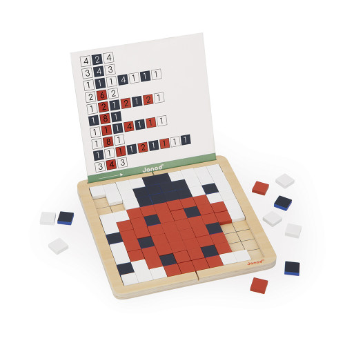 Stück für Stück entstehen Formen! Mit diesem Lernspiel werden Kinder ab 5 Jahren zu Profis in Sachen Codierung und Symmetrie. Es besteht aus einem 17,6 x 17,6 cm großen Holzbrett, 200 Holzchips, 10 Modellkarten und einer Aufbewahrungstasche. Dieses Lernspiel bietet 4 verschiedene Spielmodi. Überlagerung: Die Kinder legen eine Musterkarte auf das Spielbrett und platzieren die Spielsteine darauf; Nachbildung: Die Kinder legen die Musterkarte in die Aussparung des Spielbretts, mit dem Gesicht zu ihnen, und positionieren die Elemente auf dem Spielbrett; Symmetrie: Die Kinder legen eine Halbkarte auf das Spielbrett und bilden das Muster symmetrisch auf der anderen Hälfte nach; Codierung: Die Kinder folgen den Zahlen und Farben, die auf der Karte angegeben sind, um die Abbildung auf dem Spielbrett nachzubilden und aufzudecken. Dieses Symmetrie- und Kodierspiel ist für alle Lernstufen geeignet und fördert die Konzentration, die Beobachtungsgabe, die Logik und das Erkennen von Zahlen und Farben. Sie können dieses Lernspiel aus Holz für die Kleinen, in Gruppen, selbstständig oder in Begleitung eines Erwachsenen anbieten. Mit den Spielfiguren lassen sich ganz einfach Pixelfiguren erstellen - perfekt für Kinder im Kindergartenalter! Dieses Lernspiel zum Erlernen von Codierung und Symmetrie besteht aus FSC™-zertifiziertem Holz und Karton. Es ist Teil des pädagogischen Sortiments von Janod, das in Zusammenarbeit mit einer Lehrerin entwickelt wurde, um den Lernprozess und die Lehrpläne jeder Stufe bestmöglich zu unterstützen.