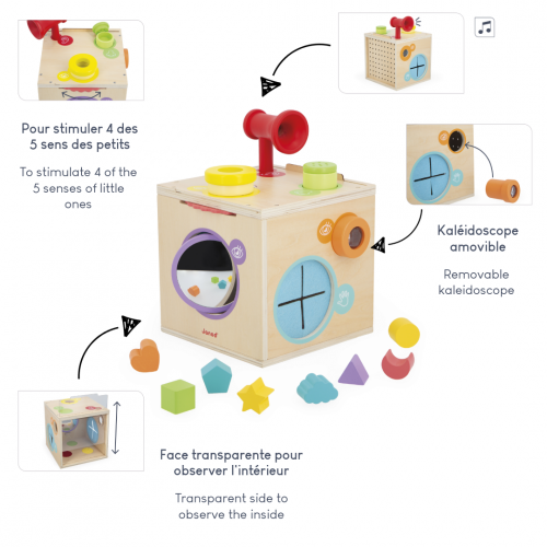 Stimulieren Sie die Sinne Ihres Babys mit diesem Sinneskasten! Dieser Aktivitätswürfel aus Holz ist für Kinder und Babys ab 18 Monaten geeignet und stimuliert vier der fünf Sinne. Mit ihm entwickeln die Kleinen ihren Geruchs-, Hör-, Tast- und Sehsinn; all dies dank spielerischer Aktivitäten, die sie in Ihrer Begleitung durchführen können! Dazu gibt es auf allen Seiten dieses Lernspielzeugs und sogar im Inneren eine Vielzahl von Sinneserfahrungen, die für noch mehr Spaß und Entdeckungen sorgen. 12 Zubehörteile sind ebenfalls enthalten, um durch Manipulation zu experimentieren. Dieses Lernspielzeug ist eine tolle Möglichkeit, die Neugierde zu fördern und die Sinne anzuregen, um die Welt um uns herum besser zu verstehen! Um den Geruchssinn anzuregen, nimmt eine perforierte Schachtel Geruchselemente auf, die ein Erwachsener hineinlegt: Gewürze, Früchte, Blumen ... Gerüche spielen eine wichtige Rolle beim Aufbau des Gedächtnisses und der Identität des Kindes. Sie stärken die Bindung zwischen ihm und seiner Umgebung. Um das Gehör zu stimulieren, kann man mit einem Megaphon die Erfahrung machen, dass die Stimme verstärkt wird: zu lustig! Was den Tastsinn betrifft, so finden Sie auf beiden Seiten der Schachtel zwei Eingänge (einen für jede Hand). Im Inneren der Schachtel platzieren Sie die 8 enthaltenen Formen, die dann blind erraten werden müssen, oder andere lustige Gegenstände! Um das Sehvermögen zu stimulieren, gibt es schließlich noch ein Guckloch, durch das man durch Farbfilter sehen kann, was sich in der Schachtel befindet. Ein drehbarer Spiegel mit einer einfachen und einer vergrößernden Seite ermöglicht es, sich selbst auf spielerische Weise zu beobachten. Auch ein kleines Kaleidoskop auf der Schachtel ermöglicht es, auf eine ganz andere Art und Weise ins Innere zu blicken. Um mehr oder weniger Licht in die Box zu bringen, sind zwei große Platten (Kunststoff und Holz) herausnehmbar, die das Erkennen von Objekten im Inneren erschweren oder erleichtern. Dieser Sinneswürfel ist ideal für stundenlanges Zusammensein mit Ihrem Kind! Sein kleines Plus? Jeder Sinn ist mit einer Farbe und einem Symbol auf der Schachtel verbunden. Wird mit einem erklärenden Büchlein geliefert. Diese sensorische Holzbox besteht aus Holz aus nachhaltig bewirtschafteten Wäldern, ist FSC™-zertifiziert und gehört zu unserer Produktreihe "Sensorik": hochgradig griffiges und robustes Spielzeug, das die Entwicklung der Sinne von Kleinkindern fördert und anregt.