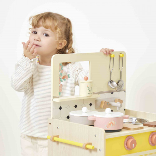 Heute auf dem Speiseplan: gegrilltes Gemüse der Saison und selbstgebackener Kuchen! Mit ihrer Holzküche denken sich Kinder ab 3 Jahren am Herd verrückte Rezepte aus und eifern den Großen nach. Ausgestattet wie eine echte und mit 11 Zubehörteilen ist diese Spielzeugküche perfekt, um Dinette zu spielen und alle möglichen Geschichten zu erfinden! Die Größe dieser Küchenzeile wurde so konzipiert, dass sie in jeden Spielraum passt: Sie misst 45 x 29,5 x 76 cm. Ihr Stil ist von Großmutters Küche inspiriert, mit all den zeitlosen Dingen, die man auch heute noch gerne findet: 2 Schneidebretter, 1 Pfanne, 1 Topf, 1 Schaumlöffel, 1 Schöpfkelle, 1 Salz- und Pfefferstreuer, 1 Gewürzglas, 1 großer Korb, 1 Fensterdekoration. Mit all ihren Utensilien bereiten die Kinder die Zutaten vor, lassen sie köcheln und würzen sie nach ihrem Geschmack. Aber das ist noch nicht alles! Der Herd ist auch mit einem Backofen mit akustischen Drehknöpfen und einer magnetischen Tür, einer Spüle mit Drehknöpfen für den Wasserhahn, Kochplatten, zwei Geschirrtuchhaltern und einem Fenster ausgestattet. Schauen Sie es sich an! Dank des abnehmbaren Dekors kann man beim Kochen den blühenden Garten beobachten! Der Detailreichtum und das kompakte Format dieser Holzküche sind einfach zum Verlieben! Ein weiterer Pluspunkt sind die neuartigen Scharniere des Ofens, die bruchfest und für einen einfachen Zusammenbau konzipiert sind. Jetzt müssen Sie sich nur noch an den Herd stellen, um ein köstliches Schmorgericht oder saftige Kuchen zuzubereiten! Diese Kinderküche besteht aus Holz, das aus nachhaltig bewirtschafteten Wäldern stammt und FSC™-zertifiziert ist. Sie ist Teil unserer Liebe Omama-Kollektion: eine Reihe von Nachahmungsspielzeugen, die von Omas Küche inspiriert sind und von Emotionen und Kindheitserinnerungen durchdrungen sind.