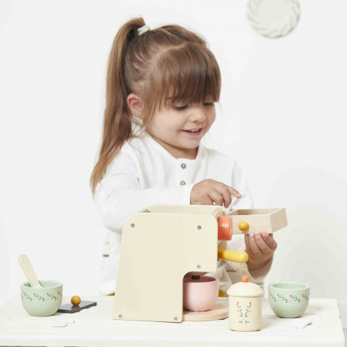 Wie wär's mit einem Kaffee? Dieses Nachahmungsset ist für Kinder ab 3 Jahren geeignet und besteht aus einer Kaffeemaschine und 5 Zubehörteilen aus Holz, mit denen man ein echter Barista werden kann. Dieses Set aus Holz eignet sich perfekt als Ergänzung zur Küche und zum Spielen von Dinette und regt die Fantasie der Kinder an, die es lieben, die Großen beim Kaffeekochen nachzuahmen. Es besteht aus : 2 Tassen, 1 Zuckerdose und Würfelzucker, 1 Kaffeekanne mit Kaffeebohnen, 1 Löffel und natürlich 1 Kaffeekanne! Öffnen Sie die Klappe an der Oberseite der Spielzeug-Kaffeemaschine, um die Kaffeebohnen zum Mahlen hineinzuschieben. Drehen Sie die Kurbel zur Seite: Es macht "Wagenheber, Wagenheber"! Sammeln Sie dann den Kaffeesatz in der kleinen Schublade auf der Rückseite der Maschine und legen Sie ihn in den Siebträgergriff. Setzen Sie den Griff in die Kaffeekanne ein und drehen Sie ihn eine Vierteldrehung, um ihn zu arretieren. Jetzt müssen Sie nur noch die Länge des Kaffees oder die Temperatur mit dem akustischen Drehknopf an der Vorderseite einstellen und schon ist der Kaffee fertig! Das Einfüllen von Kaffee und Zucker oder das Hantieren mit den verschiedenen Teilen der Kaffeekanne fördert die motorischen Fähigkeiten der Kleinen. Sie ahmen die Gesten der Erwachsenen nach und gewinnen so an Selbstvertrauen im Alltag. Wer weiß, vielleicht können sie Ihnen schon bald Ihren eigenen Morgenkaffee servieren! Diese Kaffeemaschine und ihr Zubehör bestehen aus Holz, das aus nachhaltig bewirtschafteten Wäldern stammt und FSC™-zertifiziert ist. Sie ist Teil unserer Liebe Omamal-Kollektion: eine Reihe von Nachahmungsspielzeugen, die von Omas Küche inspiriert sind und von Emotionen und Kindheitserinnerungen durchdrungen sind.