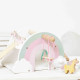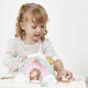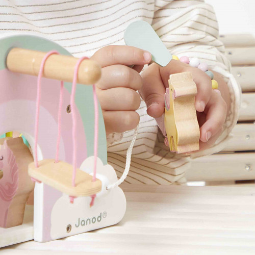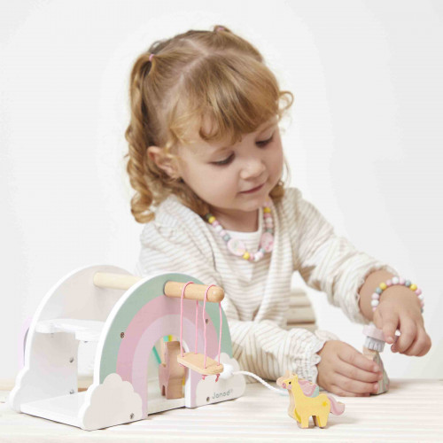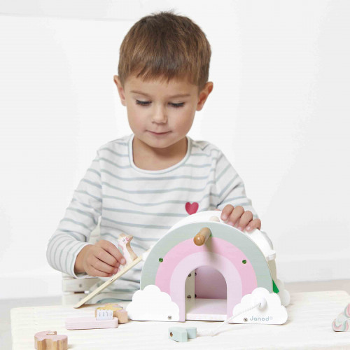 Willkommen im Haus der Einhörner! Dieses Holzhaus in Form eines Regenbogens beherbergt die märchenhaften Geschichten von Kindern ab 18 Monaten. Das magische Haus wird mit 4 Einhornfiguren und 2 Holzaccessoires geliefert und fördert die Fantasie der Kleinen. Entdecken Sie gleich alle Überraschungen, auf die sich Ihre Kinder freuen können! Zunächst einmal können sich die Einhörner nach Herzenslust austoben, indem sie eine Rutsche hinunterrutschen und wieder hinunterrutschen. Außerdem gibt es eine schöne Schaukel, auf der sie immer höher in die Wolken schwingen können! Nach einem langen Tag, an dem sie herumtollten und ihre Magie mit anderen teilten, lieben Einhörner es, gepflegt zu werden. Dazu wird die Mähne mit der mitgelieferten Bürste gebürstet und anschließend mit dem Föhn schnell getrocknet. Das ist aber noch nicht alles! Die Einhörner können das Haus durch zwei Seitentüren betreten und sogar unter einem Wasserfall aus bunten Fransen hindurchgehen. Wir verraten Ihnen, dass es sogar eine geheime Spiegeltür gibt ... Irgendetwas sagt uns, dass die Einhörner - und die Kinder - in diesem fabelhaften Häuschen viele verrückte Abenteuer erleben werden! Durch das Hantieren mit den Holzfiguren und den verschiedenen Öffnungen entwickeln die Kleinen spielerisch ihre motorischen Fähigkeiten. In seinem Format 30 x 17 x 13 cm sind dieses Holzhaus und seine Figuren sehr originell! Das Ganze besteht aus Holz aus nachhaltig bewirtschafteten Wäldern, das FSC™-zertifiziert ist. Bei Janod sind die Einhörner schlau und bedienen sich der Magie, um ihre Geheimnisse zu bewahren. Ungestüm und ikonisch, bewegen sie sich in einem poetischen Universum mit zeitlosen Farben. Lassen Sie die Magie wirken!