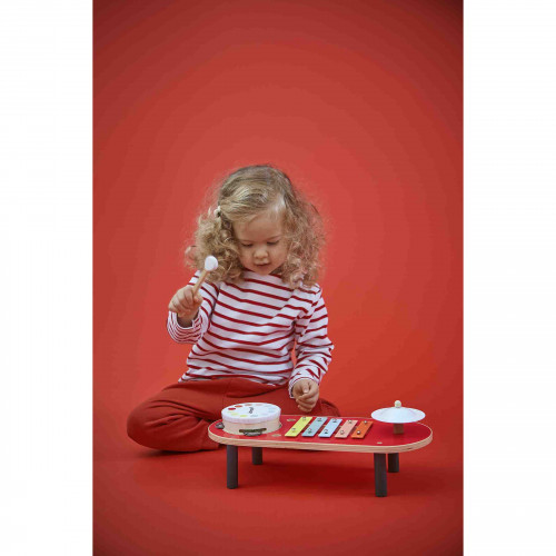 Das Baby betritt die Bühne! Die Show kann beginnen! Dieser musikalische Holztisch ist ideal für Kinder ab 18 Monaten, die spielerisch Klänge entdecken möchten. Mit seinem farbenfrohen Design und den integrierten Funktionen lädt er Kleinkinder zum Klopfen, Kratzen, Zuhören und Erfinden ihrer ersten Melodien ein! Im Lieferumfang enthalten sind: 1 Xylophon, 1 Trommel, 1 Becken und 2 perfekt für kleine Hände geeignete Drumsticks. Die Drumsticks lassen sich praktischerweise in den dafür vorgesehenen Löchern im Tisch verstauen! Dieses Rollenspielzeug fördert das musikalische Bewusstsein, die Koordination und die Kreativität. Dieser Tisch ist ein wahrer Klangspielplatz! Mit seinen weichen Formen und attraktiven Farben regt dieser Musiktisch die Neugier an und fördert die Spielfreude. Dieses Holzspielzeug gehört zur Confetti -Serie, einer kompletten Reihe von Musikinstrumenten im Pop-N'-Rock-Design! Voller Farbe und Freude ermöglichen die Confetti-Musikspielzeuge jungen Musikern, die Freude an der musikalischen Improvisation zu entdecken. Dieses Spielzeug ist aus FSC™-zertifiziertem Holz gefertigt. Ran an die Zauberstäbe, kleine Künstler!