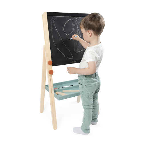 Eine Tafel wie in der Schule! Eine Holztafel ist ein Muss in jedem Kinderzimmer. Diese Holztafel ist viel mehr als nur eine Zeichenfläche: Sie begleitet Kinder beim Lernen! Dank ihrer zwei Seiten bietet sie vielfältige Möglichkeiten zum Schreiben, Zeichnen und Üben. Um das Lernen zu erleichtern und ein schulähnliches Erlebnis zu schaffen, ist eine doppelseitige Tafel ideal, auf der Kleinkinder sowohl mit Whiteboard-Markern als auch mit Kreide vertraut gemacht werden können! Die Tafel wird mit 12 laminierten Postern geliefert, die mit Magneten befestigt werden und Kindern ermöglichen, faszinierende Themen wie den menschlichen Körper, das Weltall und die Jahreszeiten zu entdecken. Außerdem gibt es 2 linierte Poster zum Üben der Handschrift. Und dank der abwischbaren Oberfläche können sie immer wieder von vorne beginnen! Diese Tafel enthält: 3 Stück Kreide, 1 abwischbaren Marker, 1 Lineal, 1 Geodreieck, 2 Magnete und 2 Aufbewahrungsboxen. Alles ist darauf ausgelegt, Kinder zu ermutigen, die Schulumgebung zu Hause nachzubilden! Diese Art von Spiel gibt ihnen das Gefühl, wertgeschätzt zu werden, selbstständig zu sein und stolz darauf zu sein, das Gelernte zu teilen. Und warum nicht auch den Kuscheltieren etwas beibringen? Ein unterhaltsames und lehrreiches Brett, ideal, um Konzentration und Lernen spielerisch zu fördern! Super praktisch: Die Höhe des Bretts ist verstellbar und wächst so mit dem Kind mit! Dieses Spielzeug ist für Kinder ab 3 Jahren geeignet und aus FSC™-zertifiziertem Holz gefertigt.