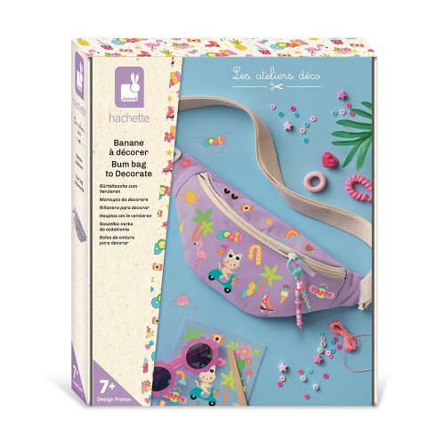 Verliebe dich in diese individuell gestaltbare Bauchtasche für Kinder! Wie schön ist es doch, eine selbstverzierte Bauchtasche zu tragen! Dieses Kreativset von Les Ateliers Déco lädt Kinder ab 7 Jahren ein, die Öko-Tex-Baumwolltasche mit sommerlichen Aufklebern zu verzieren und als i-Tüpfelchen einen passenden Schlüsselanhänger zu basteln. Die Gestaltung der Tasche erfolgt in wenigen Schritten: Zuerst werden die Aufkleber auf die lila Bauchtasche übertragen. Dazu positioniert dein Kind das Motiv auf dem Stoff, kratzt es mit dem Holzspatel ab und entfernt die Trägerfolie. Fertig ist die Bauchtasche! Anschließend werden die Buchstabenperlen, Heishi-Perlen und die bunten Formen (Herz und Stern) zum Anhänger zusammengefügt und am Reißverschluss befestigt. In nur wenigen Handgriffen verwandelt sich die 21 x 12 cm große Bauchtasche in ein trendiges Accessoire! Eine Broschüre mit Vorlagen und Anleitungen hilft Kindern bei der Bastelarbeit. Diese kreative Tätigkeit fördert die Feinmotorik, die Geduld und das Stilgefühl und bietet gleichzeitig rund 40 Minuten Spaß und die Befriedigung, ein modisches Kleidungsstück entworfen zu haben, das man jeden Tag tragen kann.