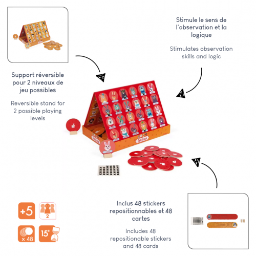 Für 2 Spieler. Welches ist das Tier Deines Gegners? Stelle geschickte Fragen, um dies herauszufinden und schließe ein Tier nach dem anderen aus, indem Du die Tiere auf dem Brett durchstreichst. Der Erste, der das jeweilige Tier errät, hat gewonnen! Beidseitig bespielbare Brett für 2 Spielstufen. Im Lieferumfang enthalten sind 48 wiederverwendbare Aufkleber und 48 Karten (24 pro Spielstufe). Spielregeln in Französisch, Englisch, Deutsch, Niederländisch, Spanisch und Italienisch. Dieses Produkt ist aus FSC®-zertifizierten Materialien und kontrollierten Materialien hergestellt.