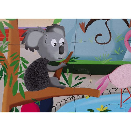 Lasst uns mit diesem 20-teiligen Puzzle für Kinder ab 2 Jahre die Tiere im Zoo kennenlernen! Sein Plus? Es ist ein Haptik-Puzzle! Es wird großen Spaß machen, das weiche Fell des Tigers oder die raue Haut des Krokodils zu erforschen, sobald das Puzzle fertig ist! Durch Streicheln und Erforschen dieser lustigen Materialien können die Kinder ihren Tastsinn entwickeln! Die wunderschönen, leuchtend bunten Bilder dieses riesigen Puzzles zeigen eine exotische Welt mit lustigen Details. Bei diesem Puzzle dient ein Poster als Vorlage, damit Kinder sofort eigenständig Spaß haben können. Dieses Puzzle misst im fertigen Zustand 65 x 50 cm und hat 7 strukturierte Teile.