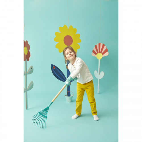 Dieser große Metallrechen mit Holzstiel wird angehende junge Gärtner begeistern. Er gehört zur Happy Garden-Serie: ein komplettes Werkzeugset für Gartenarbeit wie bei den Erwachsenen.