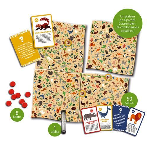 Welches Tier hat der Nachbar zu Ihrer Linken gezogen hat? In diesem lustigen und spannenden Brettspiel sollen Sie mithilfe der Merkmale jedes Tieres die Karte Ihres Nachbarn erraten. Es kommt darauf an, die richtigen Schlussfolgerungen zu ziehen! Ein Rad führt jeden Spieler durch seine Fragen. Nach ein paar Umdrehungen des Rades werden Sie in der Lage sein, das Tier zu erraten. Aber aufgepasst, Sie müssen am schnellsten sein und dürfen keine falschen Schlussfolgerungen ziehen! Jeder Spieler hat eine Tafel mit abwischbaren Filzstiften, um seine Überlegungen zu notieren. Mehr Informationen über die abgebildeten Tiere erhalten Sie in dem Heft, das Erklärungen zu jeder Art enthält. Die Spielregeln sind nur in Französisch erhältlich. Eine Spielrunde dauert etwa 15 Minuten. Das Spiel ist für Kinder ab 6 Jahre geeignet. Sie können mit 2 bis 4 Spielern spielen.