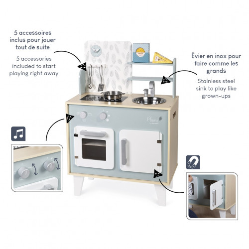 Hurry up! It's all kicking off in the kitchen! We’re rushed off our feet making a perfect meal for mum and dad! With this beautiful kitchen set, children from 3 years old will love putting together their own dishes! To help them become great chefs, this kitchen, made of natural wood and decorated in blues and greys, comes with a great range of accessories, including hooks for hanging the spaghetti spoon and metal spatula, a metal saucepan and 2 boxes of cardboard food for everyone’s favourite store cupboard essentials: pasta and cheese. Turn the 2 rotary knobs to turn on the induction hobs, complete with sound effects! This children's kitchen is also equipped with an oven, a cupboard with magnetic doors, a stainless-steel sink and a clock. This beautiful make-believe toy comes with 5 different accessories, decorated with delicate feather motifs. Worktop height: 50 cm Dimensions: 53 x 30 x 78 cm. This product is made of FSC® -certified and other controlled material.
