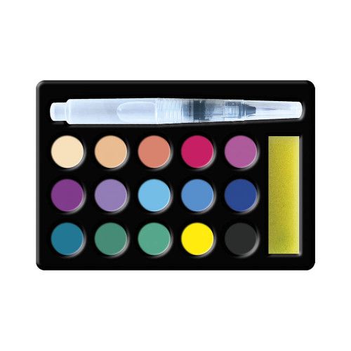 Set contents: 2 paintings to paint (including 1 with gilding details), 1 watercolour paint palette (15 pots, 1 sponge, 1 brush-pen with water reservoir), 1 frame to paint.