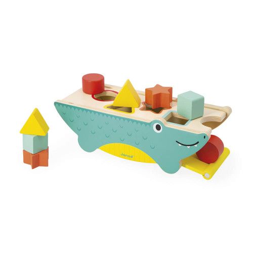 Hungry crocodile is looking for shapes to feast on! Here is an original wooden shape box that will entertain children from 12 months for long periods of time! In the shape of a crocodile, this early years toy comes with 8 parts to fit into the slots: 2 rounds, 2 triangles, 2 stars and 2 squares. Each shape corresponds to a colour, for easy learning and handling by baby. When our crocodile friend has eaten well, you can open up his mouth to collect the pieces (magnetic opening). For a peaceful meal, the inside of the shape box is covered with felt, which reduces the noise the shapes make when they fall. This early years toy is suitable for children from the age of 1, they will be able to discover shapes and colours while having fun, and develop their coordination by manipulating the pieces to be sorted. This wooden toy is made of wood from sustainably managed, FSC®-certified forests. Water-based paint.