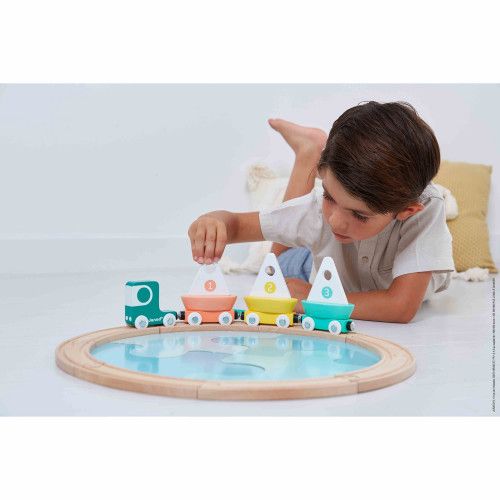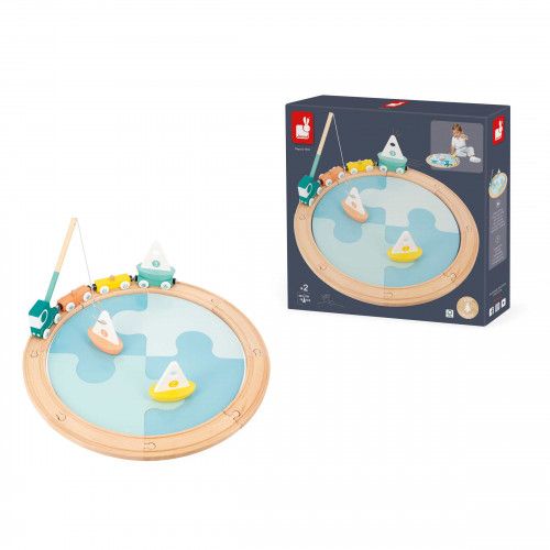 Let's spend some time at the water's edge with our pretty pastel-toned wooden sailboats! This ultra-complete early-learning game is ideal for children aged 2 years and up who like to have fun with a whole host of different means of transport! The idea is simple: create the sea to start by assembling the 4 large pieces of blue cardboard together like a puzzle, then place the 3 sailing boats on the water, ready for extraordinary angling adventures! The track - composed of 8 wooden pieces - surrounds the body of water, while a great big lorry and its 3 magnetic wagons are waiting patiently to hoist up the lovely boats! Load them up and off we go! Imagination and motor skills will come into play whilst your little one is busy playing! Clever! The fishing rod is stored at the back of the cabin when not in use. This beautiful early-learning toy from the Bolid range is made from FSC®-certified wood and cardboard.