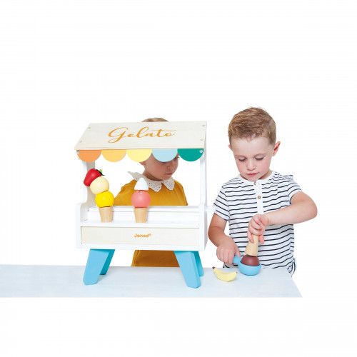Would you rather a vanilla or strawberry ice cream cone? Try all the flavours with this wooden ice cream stand! Ideal for children aged 3 years and up: this refreshing pretend play toy is great for gathering around delicious ice cream cones. Everything foodies could ever need: 3 cones, 6 scoops of different-coloured ice cream, in addition to fruit and whipped cream to further fuel the imagination! A total of 14 magnetic accessories are included for practical reasons: so nothing will fall off the cone. Even smarter: the spoon provided is also magnetic so that our little sellers can easily scoop up the ice cream! Once the customer is satisfied, the spoon can be hung on the side of the stall. Besides the 6 slots for displaying ready-to-go ice creams, the stand also boasts a storage compartment at the back. With this wooden stall, little ones can pretend to be ice cream sellers and imitate the adults, which is sure to go down a treat with the whole family! This mini stand can easily be placed on a table and encourages little ones to share: there’s bound to be something for everyone! This food-related pretend play toy also stimulates little ones’ imaginations: what if the strawberry ice cream actually tasted like bubble gum? Children will also need to carefully stack the elements and be creative, to sell the most attractive combinations. All the accessories are provided with the stand and everything is made of FSC® wood.