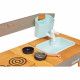 Why not try your hand at open-air cooking with this Muddy Lab: it is ready to introduce children aged 3 years and up to a whole host of experiences in the great outdoors! Once the ideal location has been found in the garden or on a terrace, little ones will simply have to put their imagination into gear to enjoy the richness of nature and everything that surrounds us! A little soil, a few blades of grass, water, pretty flowers... mix, experiment, observe and learn whilst having fun! And why not plant your own pots on this outdoor workbench or potting table? You can imagine anything with this pine pretend toy that has been specially treated for outdoor use. This actual laboratory for nature discoveries is perfectly equipped to satisfy all garden adventurers, thanks to its 2 sinks and 2 small removable plastic pots which will allow little ones to go in search of ingredients for secret potions! A real tap makes cleaning easy: simply fill the tub and then open the tap from right to left to let the water flow! A metal sieve and a paintbrush are also provided to facilitate your little explorer’s research. Finally, for all their discoveries, your child will have 2 pieces of chalk and a detachable writing surface. The worktop is 56 cm high. The Muddy Lab is made of FSC® wood. Wood is an organic material and therefore, some boards may have knots and colour variations. Protect the product from bad weather.