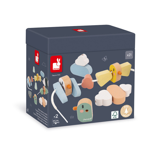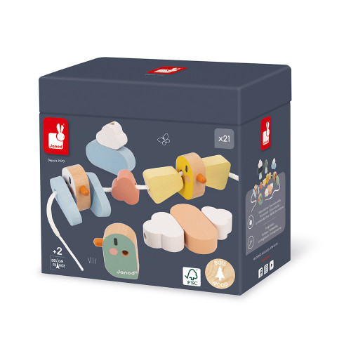 How cute are these birds? With this set of 20 threading wooden beads, babies aged 2 years and up will develop their motor skills and imagination. To create pretty birds amongst the clouds, your child will need to demonstrate concentration and precision: stringing beads on a cord is ideal for this! This set of wooden beads consists of: 4 bird beads, 8 wing beads (4 pairs), 9 cloud beads and 1 cord. Clever: the rigid tips at the end of the cord make it easier for the beads to be threaded! Your child will be able to create a pretty garland, understand their very first logical sequences, and develop their imagination by creating unique birds: what a fun educational toy! And if little ones decide not to use the cords, the wooden beads stand upright and become adorable figurines that can be manipulated, time and time again. With their first beads, toddlers will develop their imagination, logical thinking, shape recognition and, above all, their fine motor skills! Durable and ideal for relaxation, this early-years toy is made from FSC™-certified wood. It is part of our Sweet Cocoon collection.