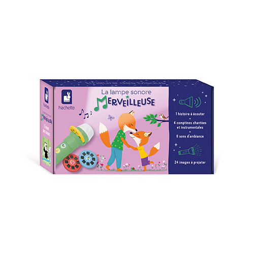 Bring children's nursery rhymes to life! With the Wonderful “Kissing Time” Sound Lamp, children from 3 years old fall asleep with dreams in their heads thanks to their own story lamp. Ideal for a bonding moment with your little one, this storyteller invites sharing in a magical universe! This pretty lamp is much more than just a children's flashlight: it is wonderful! It combines an image projector and a sound storyteller, creating an immersive experience for little ones. In total, 9 minutes of sound are available: a beautiful story entitled “I love you so much” lasting 3.5 minutes, 4 nursery rhymes accompanied by their instrumental versions lasting 3.8 minutes (“So do, do, do the little puppets", "My little rabbit", "The little fish", "Dodo, the child do") and 8 immersive thematic sounds of 126 seconds. From the purring of the cat to the reassuring sound of the heartbeat, your child escapes into the magical world of nursery rhymes when falling asleep. Our story lamp comes with 3 washers, each corresponding to the 3 buttons of the lamp and containing 8 images, as well as a storage bag. Practical and portable, this lamp fits easily into a backpack to entertain children even on the go! Its intuitive use allows little ones to take control of the stories independently. Prepare for moments of laughter and bonding at bedtime or during quiet time, whether by using the lamp independently or by using it yourself to tell the stories to your child. The three buttons, each associated with a roundel of images, allow your child to choose the universe that will accompany them into the world of nursery rhymes. Powered by 2 AAA batteries (not included), our wonderful sound lamp is ready to light up your little one's nights. Its design is super clever! The lamp comes with a cotton storage bag: no need to search under the sheets or in all the nooks and crannies when it's time for the evening story, the Janod Merveilleuse Sound Lamp quickly finds its place near your child. Give him a night filled with magic and adventure with the Merveilleuse Sound Lamp – Kissing Time, designed in collaboration with the Hachette publishing house. Sound lamp, projection lamp and story teller: everything has been designed to stimulate the imagination of little ones!