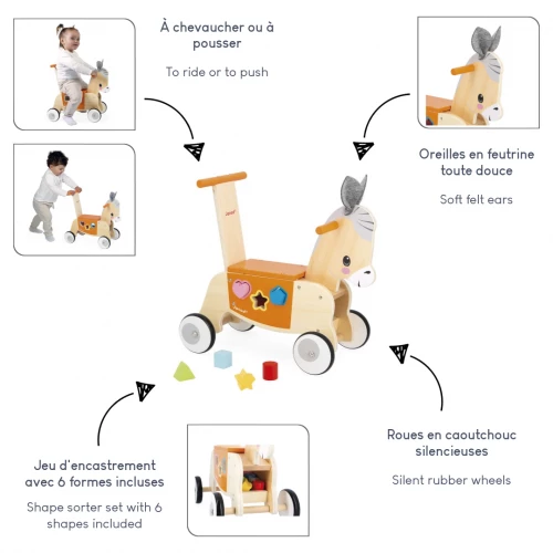 Little donkey can't wait to discover the world, and neither can baby! With this wooden donkey carrier, you're on your way to new adventures, from 12 months. Come on, hu! By riding his carrier, baby develops his sense of balance and gross motor skills, while discovering his environment. Want to push your toy or be pushed? Thanks to the handle on the back! Whichever way your little one uses his carrier, he'll learn to manage his weight and have a great time. The little extra for this early-learning toy? The shape box included, with 6 shapes to insert and retrieve from the front, so you can start all over again. Perfect for practising dexterity! Last but not least, the 4 rubber wheels are quiet and provide a good grip, so you can walk around in complete peace of mind. Ideal for encouraging gross motor skills and strengthening support for walking, this wooden carrier is a real eye-catcher, with its little felt ears and soft colors. Whether your little one loves farm animals or simply trotting, he'll be delighted! This early-learning toy is made from FSC™-certified wood from sustainably managed forests.
