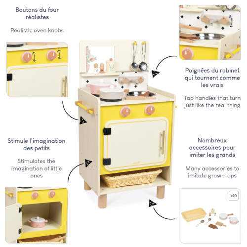On the menu today: grilled seasonal vegetables and homemade cake! With their wooden kitchen, children from the age of 3 can imagine crazy recipes at the stove and imitate the grown-ups. Equipped like the real thing and with 11 accessories, this toy kitchen is perfect for playing dinette and inventing all kinds of stories! The size of this kitchenette has been designed to fit any play space: it measures 45 x 29.5 x 76 cm. Its style is inspired by grandma's kitchen, with all the timeless items that we still love to find today: 2 cutting boards, 1 frying pan, 1 saucepan, 1 skimmer, 1 ladle, 1 salt and pepper shakers, 1 spice pot, 1 large basket, 1 window decoration. With all their utensils, children prepare ingredients, simmer them and season them to taste. But that's not all! The stove is also equipped with an oven with sound rotary knobs and magnetic door, a sink with rotary knobs for the tap, baking trays, two towel racks and a window. Take a look! Thanks to the removable decor, you can cook while watching the garden in full bloom! The richness of the details and the compact size of this wooden kitchen are to die for! Another highlight is the oven's innovative, break-proof hinges, designed for easy assembly. All that's left to do is get in the kitchen to make a delicious stew or fluffy cakes! This children's kitchen is made from FSC™-certified wood from sustainably managed forests. It's part of our Shiny Grandma collection: a set of imitation toys inspired by grandma's cooking, imbued with childhood emotions and memories.