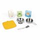 Prepare tasty little dishes for your friends, just like mom and dad, and become a Little Chef! The all-wood Happy Day Cooker includes a clock, spoons peg, metal sink, 2 rotating buttons with noise, a LED cooktop that makes sound (when you press on the red buttons once, you can turn on the lights of the induction hobs; when you press on the red buttons twice, you can hear the sound of boiling water. The light and sound turn off by themselves after 30 seconds or if you press a third time on the red buttons). 7 accessories included : 1 metal spoon, 1 metal frying pan, 1 metal colander, 1 potholder and 3 cardboard food boxes. Just like a real kitchen, it features two dials with sound effects to turn on the two induction cookers, an oven and a cupboard with magnetic doors.Height of the worktop : 50 cm.