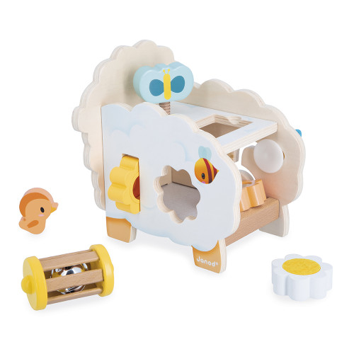How cute is this rustic wooden sheep! Flowers, a bee, a butterfly… all of nature is there! This multi-activity sheep offers many games that will delight children from 12 months old. On the front, nestled near its head, is a small magnetic bird that children can have fun removing and replacing as they please. On one side, there's a shape sorter where babies can place three flowers. This activity will require some thought from toddlers to figure out how to arrange the shapes. The best part? Each flower has a unique surface to explore: a mirror, a scratching area, and a transparent plexiglass panel to see the world in orange! On the opposite side, there's a small maze with an adorable wooden bee. The challenge for baby? To guide it along the path! A butterfly can be screwed onto the sheep's back, allowing little ones to have their first experiences with rotation. Right next to it, there's a small space for a rattle: baby can grab it, shake it, and listen to its gentle jingle. It's perfect for stimulating hearing from a very young age. Cleverly designed, the 6 accessories that make up this toy can also be stored inside! This beautiful developmental toy is made of FSC™ wood.