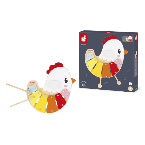 From the age of one, your baby can discover sounds and music with this charming wooden xylophone. Shaped like a hen and featuring soft, colorful accents, this developmental toy allows toddlers to produce their first sounds and develop their musical ear. With six tones ranging from blue to pink, this xylophone will be your baby's first instrument and will spark their curiosity. Cleverly designed, the hen's legs act as drumsticks and can be stored inside so they don't get lost! For even more sounds, it also features a scratcher: a textured surface that the child can rub to produce different sounds, like a small percussion instrument. Its rounded shapes and pastel colors create a soothing atmosphere, ideal for baby's first games. This adorable toy will also make a lovely decorative element in a child's room! This xylophone is made from FSC™ certified wood.