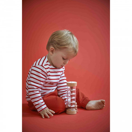 A beautiful, colorful rainstick to awaken the senses! With its vibrant colors and size perfect for little hands, this rainstick is ideal for accompanying babies from 6 months old on their musical journey. When turned over, the multicolored beads gently slide through 5 wooden propellers in 2 different shapes, producing a soft, soothing sound reminiscent of falling rain. Thanks to its transparent side, children can follow the movement of the beads and stimulate their visual acuity. This toy invites discovery: shapes, colors, sounds… everything is there to awaken the curiosity of toddlers! Easy to grasp, it encourages fine motor skills while offering a moment of calm and discovery. This rainstick is part of the Confetti range, a complete line of musical instrument toys with Pop N' Rock designs! Full of color and joy, Confetti musical toys allow the youngest musicians to discover the joys of musical improvisation. This musical development toy is made from FSC™ certified wood.