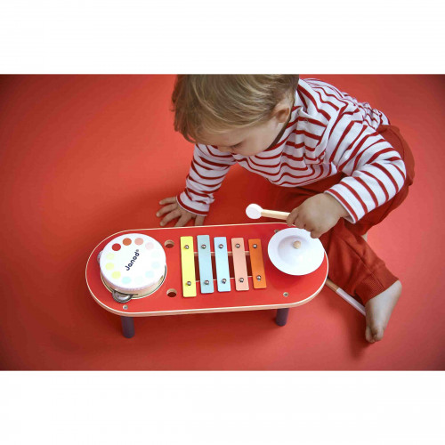 Baby takes the stage! Let the show begin! This wooden musical table is ideal for children from 18 months old who want to discover sounds while having fun. With its colorful design and built-in activities, it invites toddlers to tap, scratch, listen, and create their first melodies! It includes: 1 xylophone, 1 drum, 1 cymbal, and 2 drumsticks perfectly sized for little hands. Conveniently, the drumsticks can be stored in the holes on the table! This role-playing toy is perfect for developing musical awareness, coordination, and creativity. This table is a true sonic playground! With its soft shapes and attractive colors, this musical table stimulates curiosity and encourages play. This wooden toy is part of the Confetti range, a complete line of musical instrument toys with Pop N' Rock designs! Full of color and joy, Confetti musical toys allow young musicians to discover the joys of musical improvisation. This toy is made of FSC™ certified wood. Grab your chopsticks, little artists!