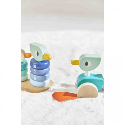 Duck family you can bring wherever you go. A superb early-learning toy that will help develop your child's motor skills. Body in cherry and beech wheels. Duck legs imitation leather. Water Painting.