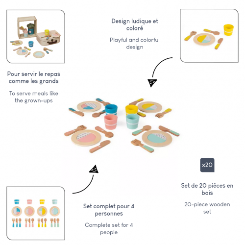 Ya casi es hora de comer, ¡así que es hora de meterse en la cocina y preparar una deliciosa comida! Con su cocinita de madera, los niños a partir de 3 años podrán imaginar locas historias entre fogones e imitar a los mayores. Equipada como una cocina de verdad y con 9 accesorios, ¡esta cocinita de juguete es perfecta para jugar a la comidita e inventar todo tipo de recetas! El tamaño de esta cocinita está pensado para adaptarse a todos los espacios de juego: mide 41,5 x 25 x 41,5 cm. El estilo se inspira en la cocina de la abuela, con todos los elementos intemporales que nos siguen encantando: 2 tablas de cortar, 1 sartén, 1 cacerola, 1 espumadera, 1 cucharón, 1 salero y pimentero, 1 especiero. Con todos sus utensilios, los niños preparan los ingredientes, los cuecen a fuego lento y los sazonan según sus gustos. ¡Pero eso no es todo! La cocina también está equipada con un horno con mandos giratorios y puerta magnética, un fregadero con mandos giratorios para el grifo, bandejas para hornear, un porta paños de cocina y un reloj. La riqueza de los detalles y el tamaño compacto de esta cocina de madera son para morirse. Otro punto a favor son las innovadoras bisagras del horno, a prueba de roturas y diseñadas para facilitar el montaje. Ya solo queda meterse en la cocina para preparar deliciosos purés caseros o crujientes galletas de mantequilla. Esta cocinita infantil está fabricada con madera procedente de bosques gestionados de forma sostenible, con certificación FSC™. Forma parte de nuestra colección Abuelita Alegre: un conjunto de juguetes de imitación inspirados en la cocina de la abuela, impregnados de emociones y recuerdos de la infancia.