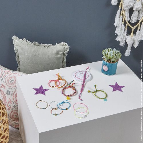 ¡Haz tus propias pulseras de la amistad con este bonito estuche! Este kit creativo contiene las instrucciones y materiales necesarios para hacer 13 pulseras de la amistad con 7 modelos diferentes para regalárselas a tus amigas o a tu madre. Luego se puede guardar o regalar todo metido en el bonito joyero incluido. Esta es una actividad creativa que fomenta la tranquilidad y la concentración. Se incluyen un montón de accesorios: 1 rueda, 6 abalorios de letras (B y F) para hacer el famoso «BFF», 1 abalorio de corazón dorado, 7 colgantes (ojo, concha, flores, love y corazón), 8 anillos, 1 cierre, 6 abalorios grises, 1 anillo con varilla, 2 abalorios pequeños, 1 cadena dorada, 1 pompón amarillo y 2 puntas doradas. Actividad manual perfecta para niños a partir de 8 años.
