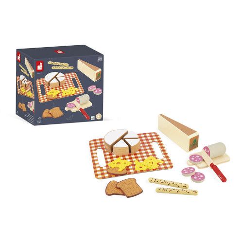 ¿Quién dijo que los aperitivos eran solo para los mayores? Gracias a este original kit de aperitivos infantiles, ¡deja que los más pequeños imaginen su propio momento festivo con los ingredientes clave de un aperitivo en toda regla! En el menú para pequeños gourmets, un programa típico francés, incluso del Jura: un queso y sus dos piezas precortadas, tres rebanadas de pan de molde, dos palitos de pan, una salchicha y sus 3 rebanadas de madera, y tres rebanadas de emmental en fieltro amarillo. Por supuesto, el inevitable Comté también forma parte de este divertido juguete de imitación. Todo ello se puede presentar en la bandeja de cartón vichy rojo y blanco o en la tabla de cortar de madera. Con el cuchillo, ¡los niños podrán cortar y untar como en la realidad! Este juego de imitación para niños de a partir de 3 años es perfecto para complementar una cocina de madera o una vajilla de juguete. También puede ser muy práctico para jugar al pícnic. Los niños podrán crear su propio momento de convivencia y compartir muchas historias de aperitivos con amigos o familiares. Este producto está hecho de material certificado FSC® y otro material controlado.
