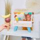 ¿Helado de vainilla o cucurucho de fresa? ¡Prueba todos los sabores con este puesto de helados de madera! Este refrescante juguete de imitación, ideal para niños a partir de 3 años, promete buenos ratos de juego con un montón de deliciosos conos de helado. Tiene todo lo necesario para disfrutar de un buen helado: ¡3 cucuruchos, 6 bolas de distintos colores, frutas y hasta nata montada como topping! En total, incluye 14 accesorios magnéticos, muy prácticos para que no se te caiga el contenido de tu cucurucho. La cuchara incluida también está imantada para que los pequeños vendedores cojan fácilmente las bolas de helado. Después de atender al cliente, la cuchara se cuelga del lateral del tenderete. Con seis huecos para presentar los helados para llevar, el puesto también tiene un espacio de almacenamiento en la parte trasera. Con este stand de madera, los niños juegan a tener una heladería imitando a los mayores para disfrute de toda la familia. Este puestecito se puede colocar fácilmente encima de una mesa y es ideal para pasar buenos ratos compartiendo: ¡hay para todos! Además este juguete de imitación tan goloso estimula la imaginación de los pequeños: ¿y si el helado de fresa en realidad fuera de chicle? Y hay que ser minucioso para apilar cuidadosamente los elementos y echar mano de toda su creatividad para imaginar las composiciones más atractivas. El puesto se vende con todos sus accesorios y todo el conjunto está hecho de madera FSC®.