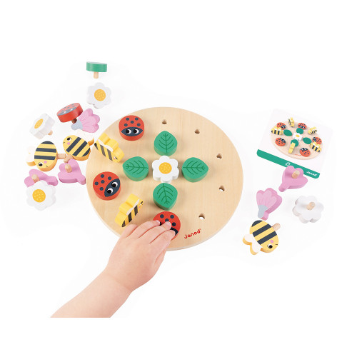 ¡Bienvenidos a mi jardín! Con este bucólico juego educativo, los niños a partir de 2 años desarrollan la imaginación y la capacidad de observación, mientras se divierten. Tienen a su disposición 2 modos de juego para mantener el equilibrio perfecto entre concentración e inventiva. El primer modo de juego consiste en colocar los diferentes elementos sobre el soporte siguiendo un ejemplo: luego hay que observar atentamente, concentrarse y aprender a localizar la ubicación de cada pieza con respecto a las demás. La segunda modalidad de juego consiste en que el adulto describa de viva voz el ejemplo en cuestión y el niño identifique la ubicación de las piezas en la mandala. Por tanto puedes ofrecer a los niños un juego educativo que se puede jugar de forma independiente o en parejas, para adaptarse siempre a su ritmo de progreso. Y, una vez terminada la fase de aprendizaje, ¡es hora de jugar! Deja que el niño cree su propio jardincito y organice los elementos como quiera. Este juego de madera consta de: 1 tablero de madera, 5 abejas, 5 flores rosas, 5 margaritas, 5 hojas, 5 mariquitas de madera y 12 modelos de ejemplo. Este juego educativo, ideal para trabajar la imaginación y la capacidad de observación de los niños, propone una inmersión en el curioso mundo del jardín. Está hecho de madera y cartón con certificado FSC™. Este juguete forma parte de la gama pedagógica de Janod diseñada en colaboración con una maestra para ajustarse al máximo a los aprendizajes y programas de cada nivel.