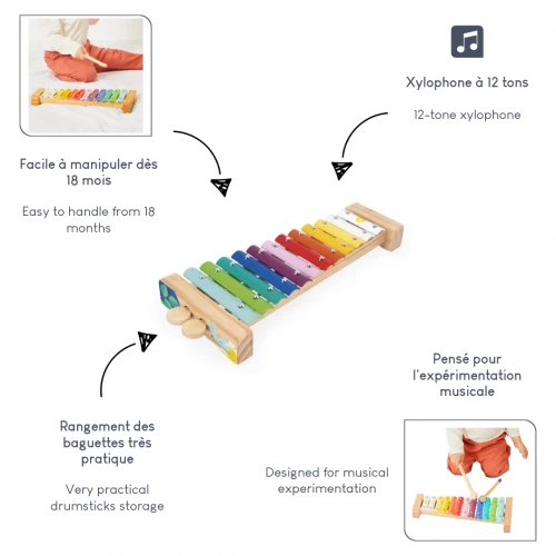 ¡Pongámonos musicales! Este xilófono de madera es adecuado para niños a partir de 18 meses. Tiene 12 tonos y viene con 2 baquetas para imitar los instrumentos que usan los mayores. Ideal para desarrollar el gusto por la música y el talento musical desde la más tierna infancia, este juguete musical se presenta en bonitos colores: los de nuestra gama Gioia. La madera natural se adorna con vivos colores en cada extremo del xilófono. Con su instrumento musical de juguete, los niños podrán imaginar sus propias melodías e imitar a los mayores con su propio instrumento. Mide 38 x 16 cm, es fácil de sujetar y muy sencillo de usar para los más pequeños. Toda la familia puede bailar y cantar con este juguete de imitación. Forma parte de nuestra gama Gioia, una invitación al despertar musical de forma alegre, que permite a los más pequeños descubrir el mundo de los sonidos de forma divertida y compartida. Juguete xilófono fabricado con madera procedente de bosques gestionados de forma sostenible, certificado FSC™. ¡Música, maestro!