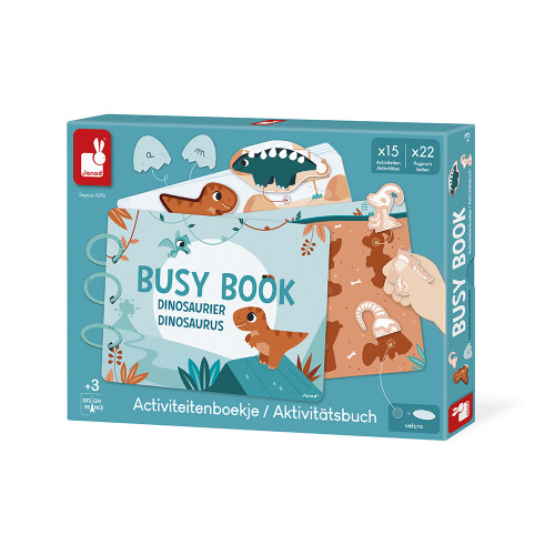 ¡Bienvenidos a los Dinosaurios! Este entretenido libro, con sus 22 páginas de actividades, introduce a los niños de 3 años en adelante al fascinante mundo de los dinosaurios. Aprenderán a reconocer diferentes especies, comprender dónde vivían, su tamaño y mucho más. ¡Hay muchísimas cosas para observar y manipular! Los niños encontrarán sus dinosaurios favoritos: el T-Rex, el Triceratops, el Diplodocus... ¡e incluso el Pterodáctilo! Cada página los invita a manipular, observar y nombrar las piezas, haciendo que el aprendizaje sea divertido. ¡Hay un total de 149 piezas para colocar en el libro! Las ilustraciones, suaves y coloridas, están diseñadas para despertar la curiosidad, enriquecer el vocabulario y desarrollar la motricidad fina. Y eso no es todo: los niños mayores también pueden aprender los números y el alfabeto, tanto en mayúsculas como en minúsculas. Un verdadero estímulo para el desarrollo del lenguaje y las habilidades escolares tempranas. Práctico y adaptable, este libro de actividades está encuadernado con tres anillas de plástico desmontables, lo que permite a los padres seleccionar las páginas que mejor se adapten a la edad y el ritmo del niño. ¡Una manera maravillosa de que el libro crezca con ellos! Este juguete de aprendizaje temprano es perfecto para el juego independiente. Gracias a su formato de libro, ¡es fácil de llevar a todas partes! Dimensiones: 27 x 21 cm. Este libro de actividades está hecho de cartón con certificación FSC™. ¡Que empiece el descubrimiento!