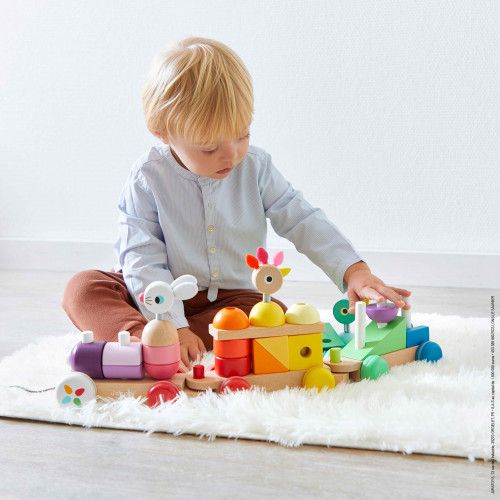 ¡Bienvenidos a bordo del tren gigante Zigolos! ¡Toma asiento, el tren está a punto de salir! Este juguete de madera 2 en 1 es un juguete de arrastre de primera infancia para ayudar a los bebés a desarrollar su motricidad, pero además es un juego de apilar. Gracias a los distintos bloques que se ponen en los vagones, a partir de 1 año los bebés aprenderán las formas y los colores mientras se divierten. ¡El tren gigante Zigolos es un completo juguete que conquistará al niño especialmente por sus bonitos colores y los divertidos animales de los vagones! ¡No es de extrañar, ya que su cabeza se balancea en cuanto el tren se pone en marcha gracias al muelle del cuello! ¡El pato, la gallina y el conejo están listos para descubrir el universo del bebé! El niño puede reconstruir como en el ejemplo o combinar los bloques de madera como quiera. Para mayor comodidad, las ruedas son silenciosas gracias a la goma antideslizante. Longitud de la cuerda: 50 cm. Pintura al agua.