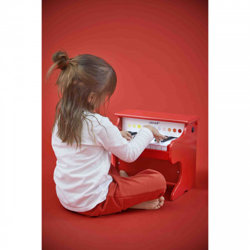 Esta bonita réplica de un piano con lunares de colores hará las delicias de los pequeños músicos que, a partir de 3 años, quieran descubrir el piano y la música. Hay cuatro partituras para que el niño toque el piano como un auténtico prodigio (Alouette, Twinkle twinkle little star, Au clair de la lune y Frère Jacques). El niño también podrá crear su propia música dando rienda suelta a su imaginación gracias a las 18 teclas que emiten cada una un sonido diferente. El piano tiene una práctica función gracias a la cual se pone en modo de espera automáticamente si el niño pasa 2 minutos sin tocarlo. Para utilizar este juguete en buenas condiciones, necesitará cuatro pilas LR03 de 1,5 V que no están incluidas. ¡Confetti es una completa gama de instrumentos musicales de juguete con dibujos Pop N'Rock! Los juguetes musicales Confetti estimulan todos los sentidos y permiten a los pequeños músicos en ciernes iniciarse en la improvisación musical.