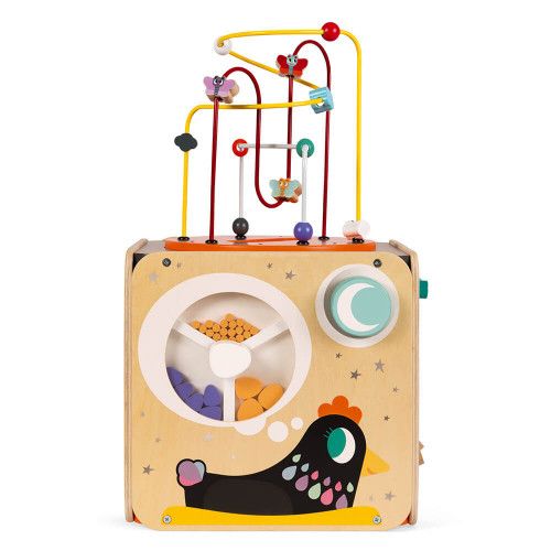 ¡Al bebé le espera un recorrido lleno de sorpresas! Este maxilooping de madera cuenta con un montón de actividades para entretener al peque. Este juguete de aprendizaje temprano está compuesto por una cara sonora con un molino lleno de huevos de madera de diferentes tamaños que el niño puede girar con el asa y un botón de luna que hace ruido al activarlo. En otra de las caras, hay un engranaje de tres ruedas, un espejo y una oruga en la que cada parte gira en un eje para dejar ver un nuevo color. Este juguete de primera infancia también incluye un laberinto, cinco piezas de encajar para aprender las formas y los colores y un looping. Este maxilooping estimula el oído, la concentración y la motricidad del pequeño. Para guardarlo más fácilmente, el looping se gira para introducirse dentro del cubo.