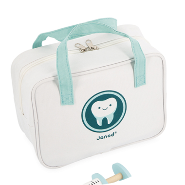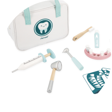Qui va rendre une petite visite au dentiste ? Avec ce chouette kit du parfait dentiste, tout le cabinet dentaire s'invite à la maison pour des moments de jeu et de rire en famille ou entre amis ! Les enfants à partir de 3 ans seront ravis de prendre la place du spécialiste et de s'exercer avec les nombreux accessoires en bois de cette mallette : une pince, une seringue pour l'anesthésie, un dentier avec 8 dents amovibles, un miroir dentaire pour dénicher la moindre carie, une fraise, un tube de dentifrice et une brosse à dents, pour que le patient puisse repartir avec ses petits échantillons ! 2 cartes illustrant des radios dentaires permettent aux enfants de poser leurs diagnostiques. L'ensemble des éléments aux couleurs toutes douces (peinture à l'eau) se range dans la trousse transportable qui arbore une sympathique dent souriante, de quoi dédramatiser les rendez-vous chez le dentiste ! Ce produit est composé de matériaux certifiés FSC® et de matériaux contrôlés.