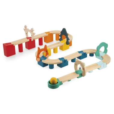 Le premier circuit de balle des bambins, suspense et créativité garantis ! Un véritable parcours à assembler encore et encore, plein de combinaisons sont possibles : les enfants dès 2 ans ne vont pas s'en lasser ! Des portes, une clochette, plein de couleurs ... De nombreux circuits en bois sont à construire, des exemples sont fournis pour guider petits et grands ! On imagine et on construit le parcours, puis on observe la balle se frayer un chemin : un vrai régal. Cet set complet contient 44 pièces en bois au total, soit : 13 connecteurs, 12 piliers, 12 rails, 6 portes et 1 balle. Un super moyen de développer la motricité fine, l'imagination et la résolution de problèmes simples ! Un jeu de construction plein de surprises qui amusera les enfants pendant des heures, en bois issu de forêts gérées durablement, certifiées FSC®. Peinture à l'eau.