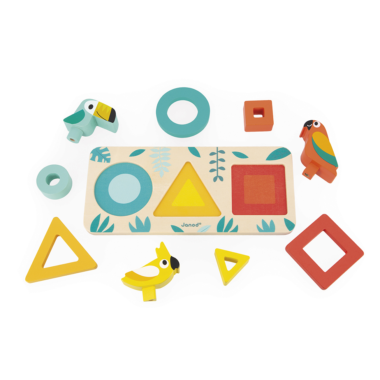 Qu'ils sont beaux ces oiseaux tropicaux ! Prenez votre envol direction les pays chauds avec ce jouet d'éveil 3 en 1 en bois : les enfants à partir de 12 mois vont s'amuser pendant des heures ! Ils apprennent les formes en encastrant les 6 éléments (rond, carré, triangle) dans le support en bois, ils se familiarisent avec les couleurs et développent leur motricité fine et leur coordination en encastrant les pièces au bon endroit. Chaque couleur est associée à une forme et à un oiseau ! Un jeu d'encastrement et d'association en bois qui amusera bébé dès 1 an. En bonne compagnie avec ces trois jolis oiseaux, votre enfant développera sa coordination main-oeil. Ce jouet premier âge coloré donnera une touche tropicale à la chambre de bébé ! Jouet pour bébé peint à l'eau et en bois issu de forêts gérées durablement, certifiées FSC®.