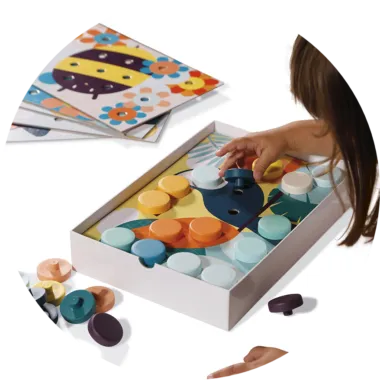 Les premières mosaïques de bébé ! Offrez à votre enfant un monde coloré avec ce set de pièces en bois et ces jolis tableaux à décorer. Destiné aux enfants dès 2 ans, ce kit de mosaïques en bois est idéal pour développer la motricité fine des petits ! Abeille, éléphant, baleine ... De beaux tableaux au style printanier sont prêts à prendre vie au fur et à mesure que bébé place les pièces en bois au bon endroit. La taille des pièces est pensée pour les petites mains (3,6 cm de diamètre), pour une manipulation facile ! Le petit plus : la boîte sert de support pour les cartes, les enfants peuvent ainsi s'amuser en toute simplicité. Avec leur design doux et tendance, ces cartes à orner de mosaïques seront parfaites pour un temps calme avec bébé. Pas besoin de colle, c'est une activité que les enfants prendront plaisir à recommencer encore et encore ! Un jouet d'éveil qui contient : 6 cartes perforées en carton et 38 pièces en bois.