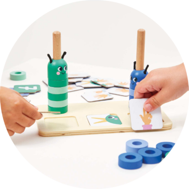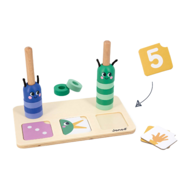 C'est tellement plus facile d'apprendre à décomposer les nombres quand c'est drôle ! Nos 2 chenilles malicieuses sont prêtes à aider les tout-petits dans l'apprentissage des compositions et des comparaisons ! Ce joli jeu éducatif en bois destiné aux enfants à partir de 3 ans va permettre de simplifier la compréhension de cette notion en matérialisant les chiffres et en manipulant des éléments en volume. Les enfants devront s'aider des perles de couleurs formant le corps des chenilles pour représenter les nombres des 33 cartes du jeu. Les nombres à reconnaitre peuvent prendre la forme de chiffres, des doigts de la main ou de la constellation d'un dé. En empilant les perles sur le support en bois, l'enfant comprendra combien il faut ajouter ou enlever de perles au corps de la chenille pour obtenir une quantité donnée. Une fois cette première étape maitrisée, vous pourrez aborder la notion de comparaison "plus grand que" et "plus petit que" grâce aux cartes dédiées. Une notice explicative vous permettra d'utiliser au mieux ce jeu destiné aux enfants de petite, moyenne et grande section de maternelle. Ce jeu fait partie de la gamme pédagogique Janod, développée en collaboration avec une professeure des écoles afin de coller au mieux aux apprentissages et aux programmes de chaque niveau. Il est fabriqué en bois et carton FSC®.
