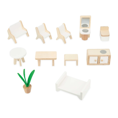 Bienvenue chez nous ! Maison de poupée en bois sur 3 étages située au cœur de la chambre de votre enfant, c'est la demeure rêvée pour les personnages des petits dès 3 ans. Confortable, la maison est meublée avec 11 accessoires en bois : 1 canapé, 1 petite table et 1 plante verte pour le salon, 1 table ronde, 1 chaise et 1 meuble de rangement pour la salle à manger, 1 lit, 1 chaise et 1 grande table pour la chambre, 1 ensemble lavabo et miroir et 1 WC pour la salle d'eau. Le grenier au dernier étage peut être aménagé ou décoré selon les envies du petit propriétaire. Pas de travaux nécessaires ! Décorée avec de belles impressions au sol et aux murs, cette charmante maison en bois dispose d'ouvertures magnétiques et propose ainsi une grande surface de jeu. Les 2 portes se referment facilement pour ranger tout le contenu et offrir un peu d'intimité aux habitants. Compatible avec les personnages jusqu'à 12 cm, cette maison pour poupées invite aux histoires les plus incroyables ! Grâce à ses 4 pieds, la jolie résidence est stable et facile à déplacer : pour un déménagement express et sans stress ! Elle est fabriquée en bois FSC®. Le look sobre et intemporel de cette jolie maison en fait le jouet d'imitation et d'imagination idéal, le centre de l'univers de tous les personnages de votre enfant. Voici les clés !