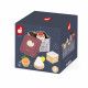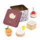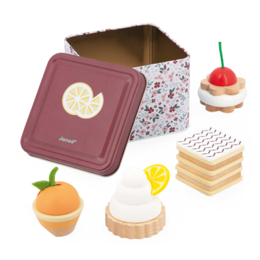 Janod s'occupe du dessert ! Laissez-vous tenter par l'une des 4 pâtisseries présentes dans ce coffret en métal. Destiné aux enfants à partir de 3 ans, ce set d'accessoires en bois invite à la gourmandise ! Vous avez le choix entre : 1 tarte citron meringuée, 1 millefeuille, 1 religieuse au chocolat ou 1 gâteau à l'abricot. Le tout présenté dans une jolie boîte à gâteaux. Voilà des délices réalistes qui complètent à merveille la dinette ou la petite cuisine des enfants ! En bois, avec parfois de la douce feutrine, mais toujours avec gourmandise ; ce set d'imitation invite au partage en toute occasion ! A l'heure du thé, pour le goûter ... Ce set de pâtisseries pour enfant permet de développer l'imagination et les interactions avec les autres. On offre son gâteau préféré à sa poupée, on joue à la marchande, on imagine la préparation des pâtisseries dans sa cuisine ... Tous les gourmands adorent ! Ce coffret fait partie de la gamme Twist de Janod, des jouets d'imitation qui accompagnent les enfants dans toutes leurs expérimentations en cuisine.